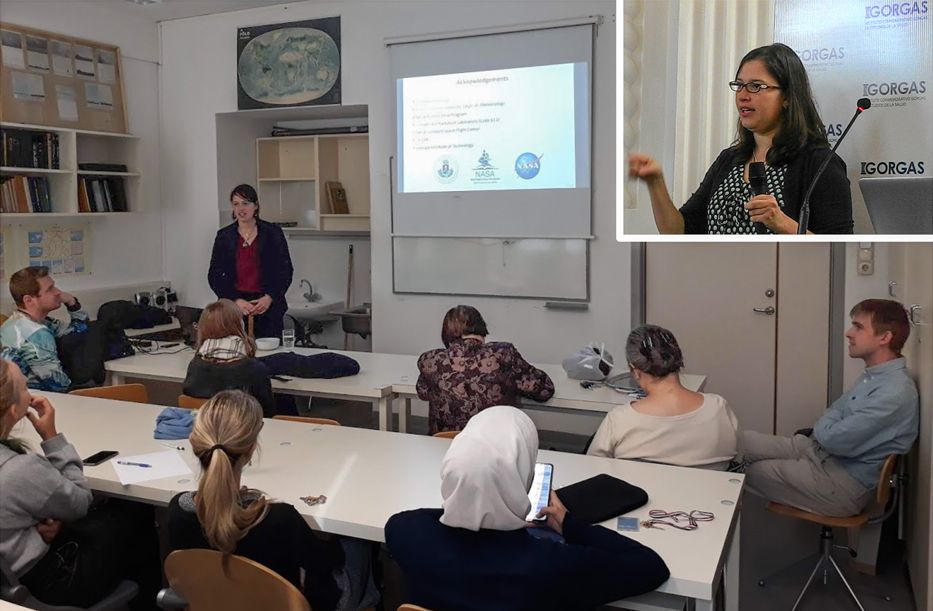 In the upper-right photo, I’m giving an invited talk in Spanish on select Goddard Air Quality and Public Health applied research at the Gorgas Memorial Institute for Health Studies in Panamá City, Panamá, on Oct. 22, 2018. In the lower-left photo, I’m presenting my research on improving regional air quality modeling using surface and satellite observations to meteorology students at Eötvös Loránd University in Budapest, Hungary, on Sep. 23, 2019.