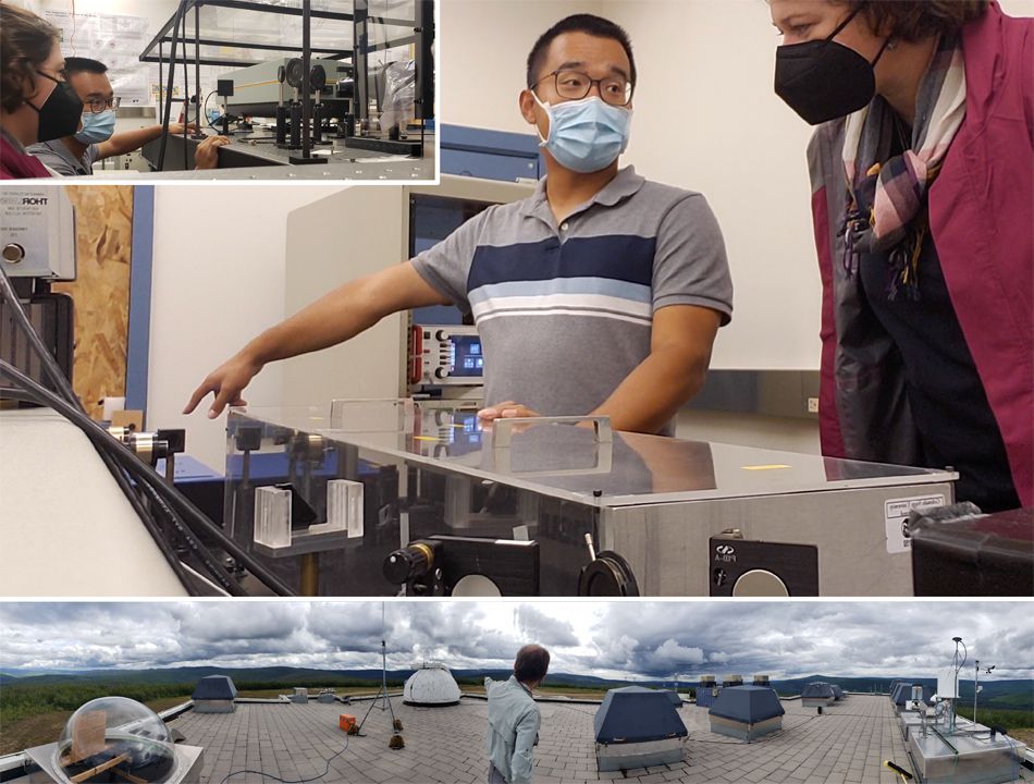 Drs. Don Hampton and Jintai Li, from the Geophysical Institute, UAF, giving me a tour of the Poker Flat Research Range (PFRR) on Aug. 12, 2021. In the top photo, Dr. Li shows me the Lidar Research Facility instruments at PFRR. He works with models and observations to understand the role of waves in regional and global circulation as part of the Collins Research Laboratory team. The bottom photo is on the roof of the PFRR Neal Davis Science Operations Center with Dr. Hampton, where he and his colleagues have optical instruments set up to observe and study the aurora and upper atmosphere (lower photo).