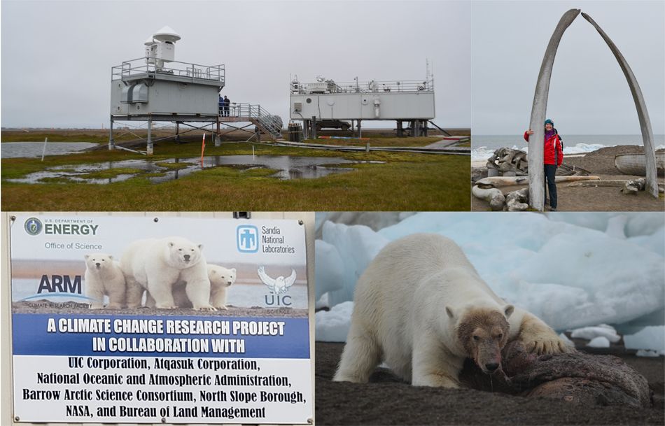The DOE Atmospheric Radiation Measurement (ARM) North Slope of Alaska (NSA) Research Facility in Utqiaġvik, AK (left side photos). The famous Utqiaġvik Whale Bone Arch (upper right). Immediately after our ARM NSA site visit, we sighted a polar bear dining on a walrus (lower right).