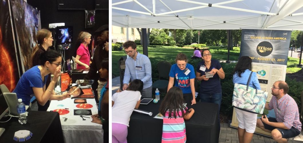 Right: Outreach event I organized for the total solar eclipse of 2017 as a collaboration between NASA, the National Academies of Sciences Koshland Museum, and the Catholic University of America. Many friends from the three institutions volunteered their time and expertise, we even had two ASL interpreters who turned out to be an asset.