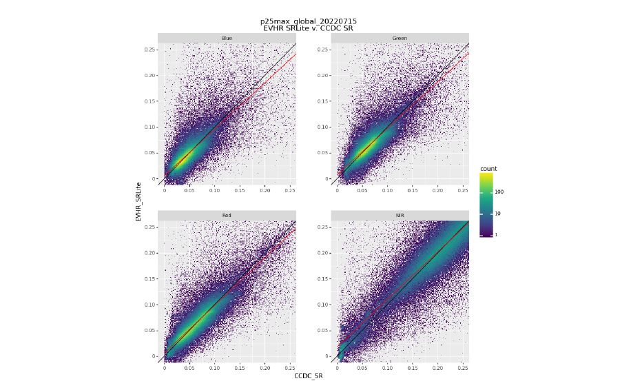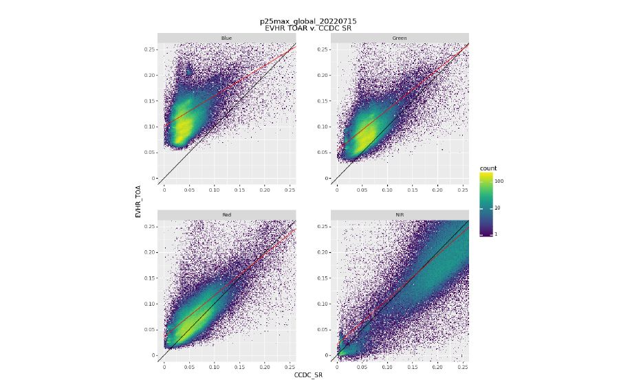 Surface Reflectance – lite (SR-lite) is an extension of EVHR that takes the orthorectified TOAs and uses Landsat Continuous Change Detection Classification (CCDC) to generate a pseudo surface reflectance product that helps to minimize the atmospheric effects on the Maxar data. The goal of EVHR and SR-lite is to make the Maxar data more analysis ready.
