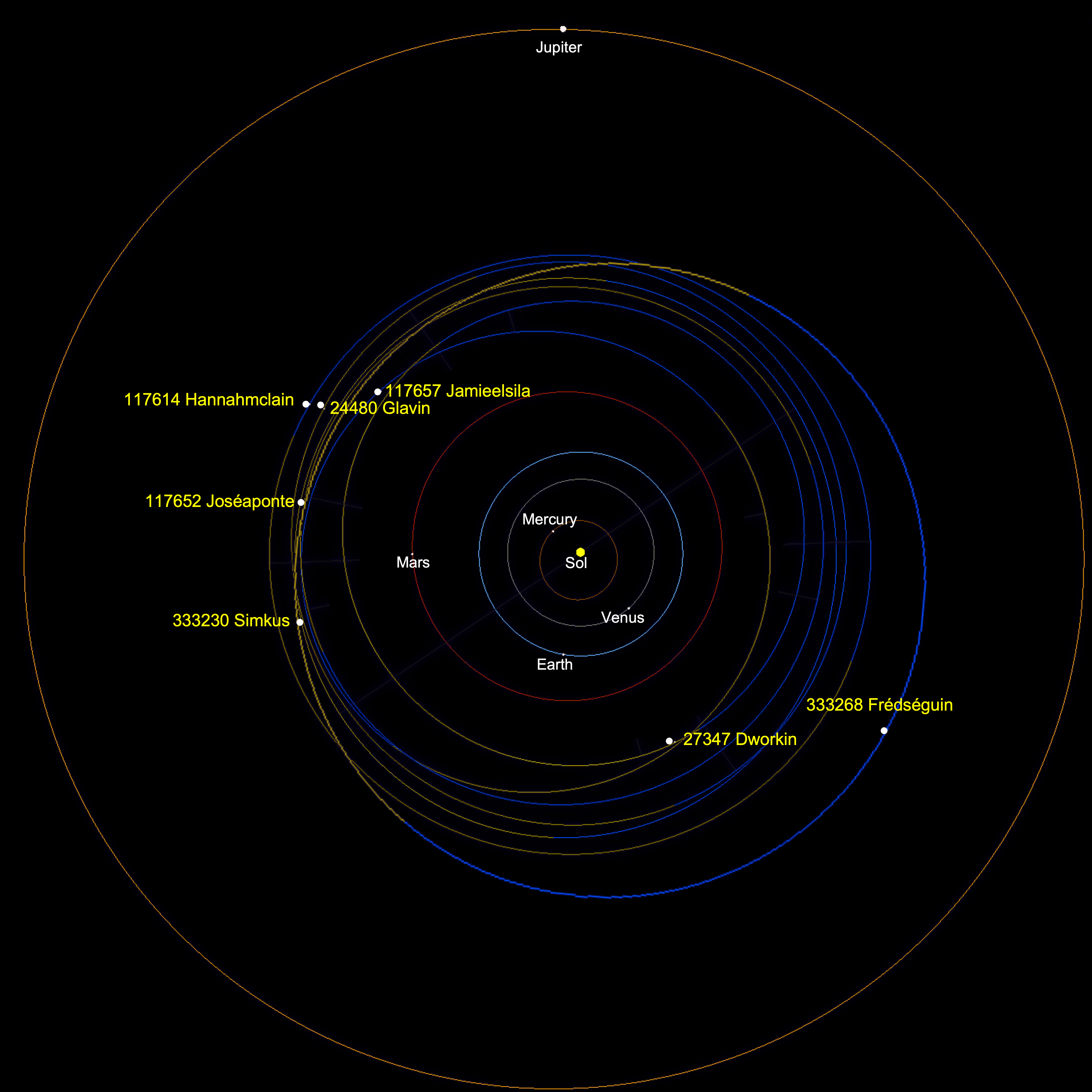 Several members have been honored by having asteroids named after them. (Click for full image, including the location of Jupiter's orbit.)
